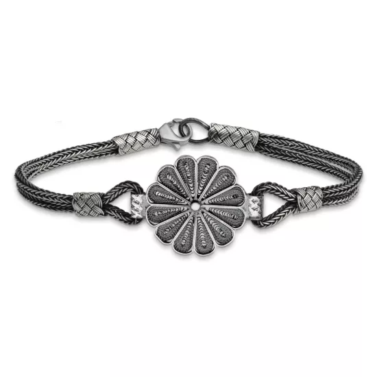 Zarafeti geleneksel el işçiliğiyle buluşturan Gümüş Oksitli Papatya Kazaziye Bileklik, özel tasarımıyla stilinize seçkin bir dokunuş katıyor. Tamamı elde örülen kazaziye bilek kısmı, dayanıklı yapısıyla uzun yıllar kullanım sunarken, merkezde yer alan papatya motifli oksitli detay şık bir nostalji hissi oluşturur.925 ayar gümüşten üretilen model, oksit kaplama sayesinde güçlü bir karaktere sahip koyu tonlar sunar. Hem günlük kombinlerde hem özel davetlerde rahatlıkla tercih edilebilen bileklik, geleneksel sanatın modern yorumunu bileğinizde taşımak isteyenler için ideal bir seçimdir.Sevdiklerinize anlamlı bir hediye olarak da mükemmel bir alternatif sunan bu özel tasarım, zarif ve özgün görünümüyle takı koleksiyonunuzun favorileri arasına girmeye adaydır.